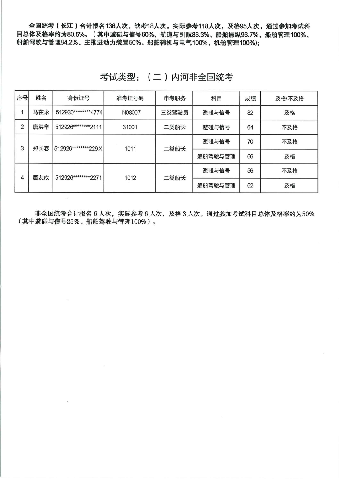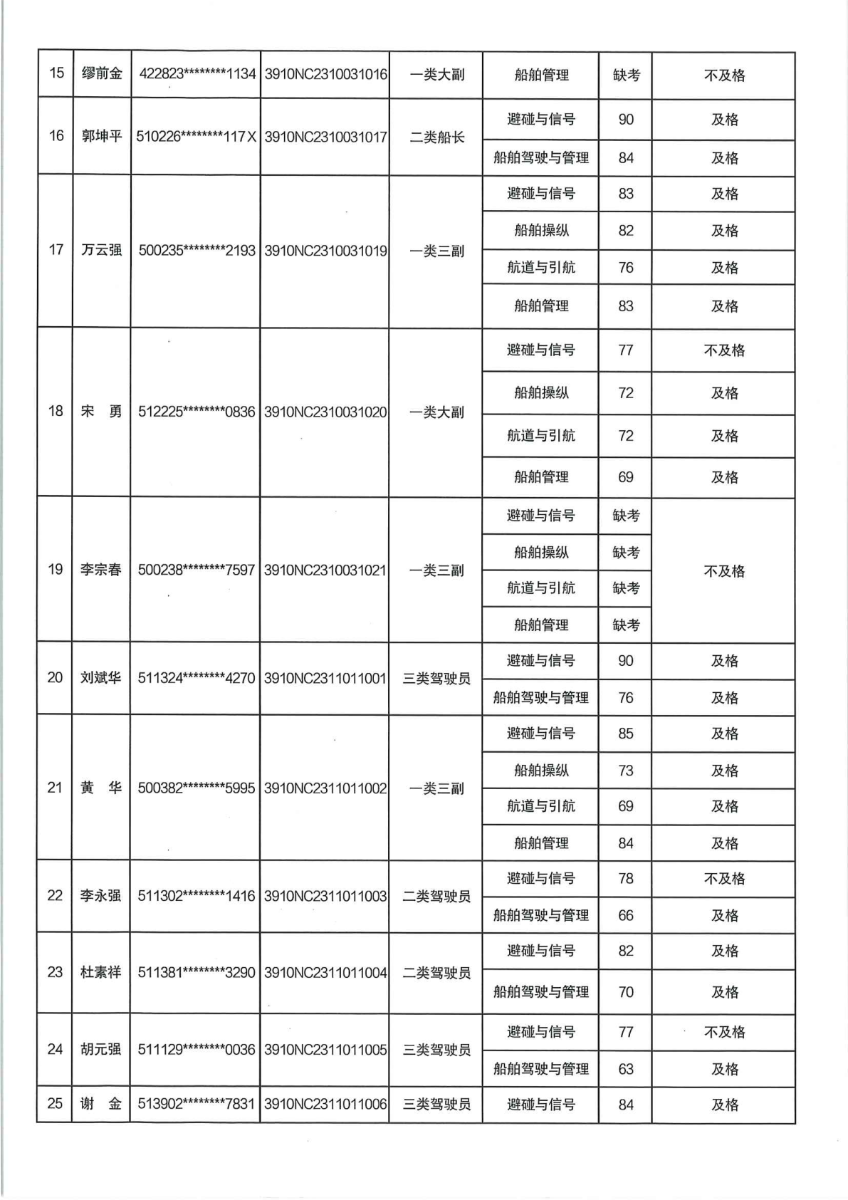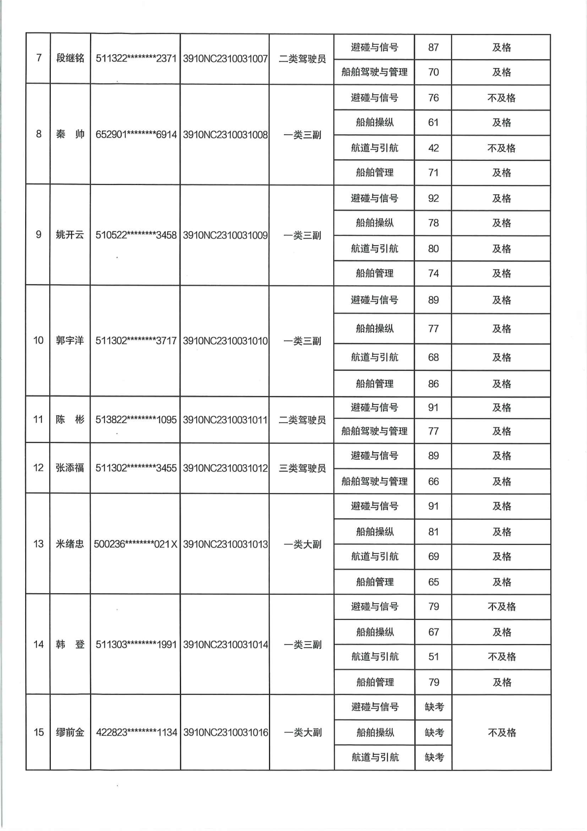 中华人民共和国内河船员适任考试第3910NC231101期(南充考点ST20231101期)理论成绩公示