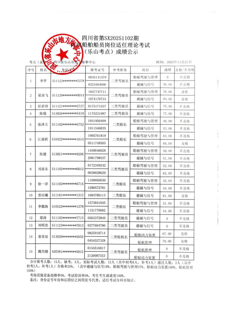 四川省第SX20251102期适任岗位理论(乐山考点)成绩公示