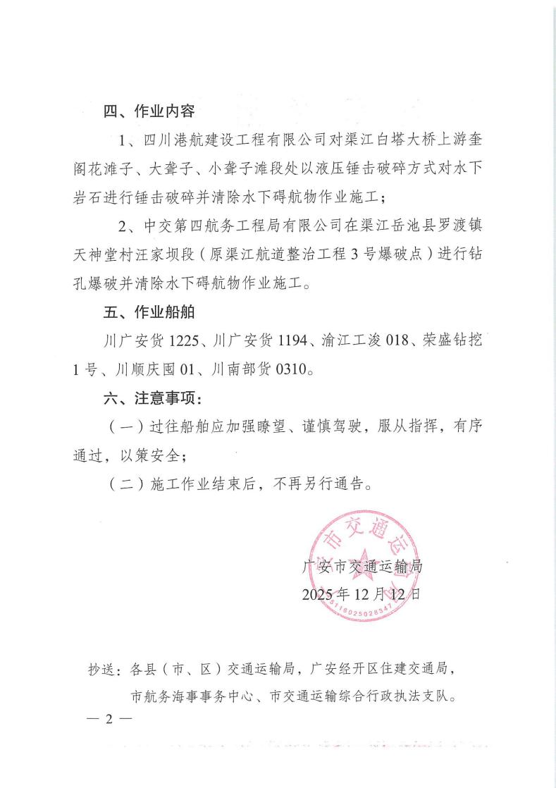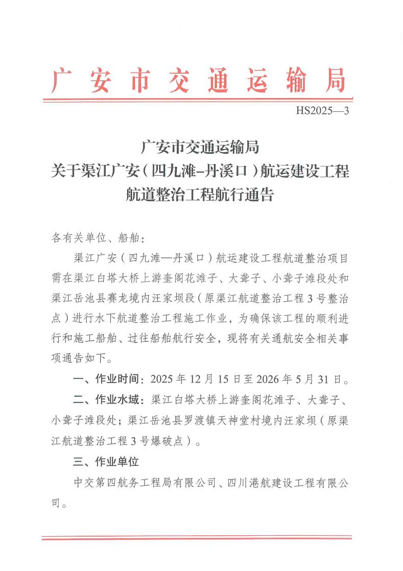 HS2025—3航行通告渠江广安(四九滩-丹溪口)航运建设工程航道整治工程