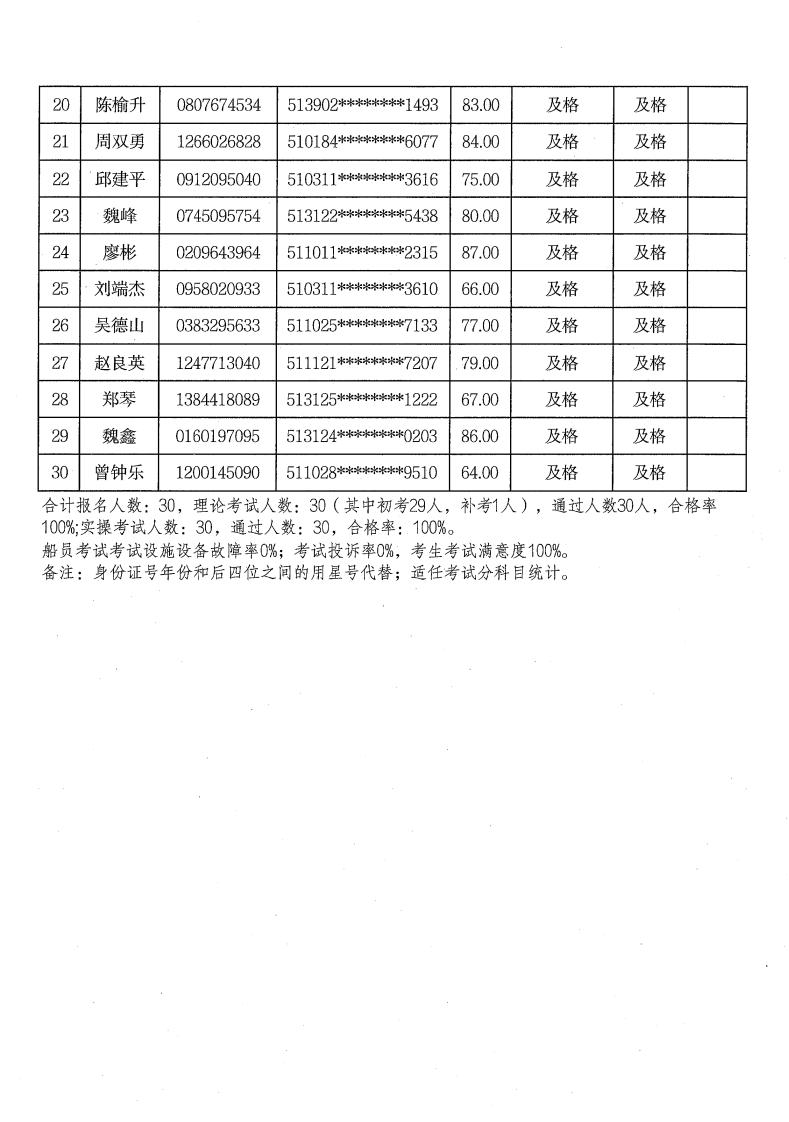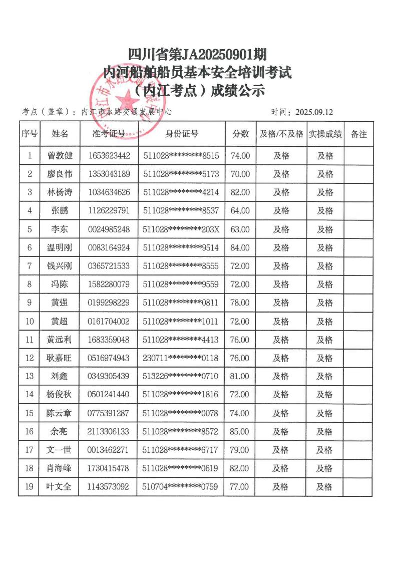 四川省第JA20250901期内河船舶船员基本安全培训考试(内江考点)成绩公示