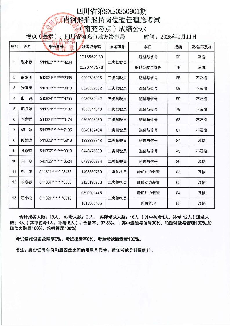 四川省第SX20250901期内河船舶船员岗位适任理论考试(南充考点)成绩公示