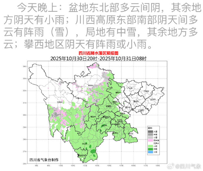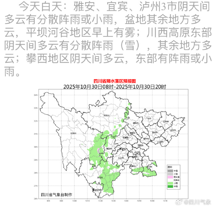 今天白天到晚上:盆地东北部多云间阴,其余地方阴天间多云有小雨,平坝河谷地区早上有雾;川西高原东部南部阴天间多云有阵雨(雪),局地有中雪,其余地方多云;攀西地区阴天间多云有阵雨或小雨,南部局地有中雨。24小时内,盆地最低气温:12~15℃;最高气温:19~22℃。