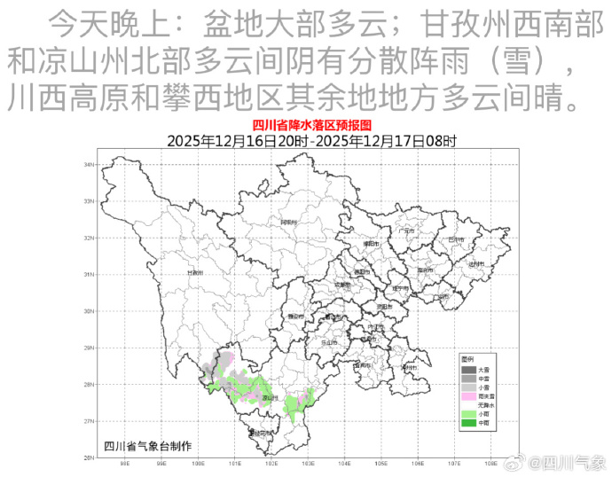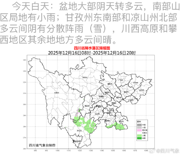 今天白天到晚上:盆地大部阴天转多云,南部山区局地有小雨;甘孜州南部和凉山州北部多云间阴有分散阵雨(雪),川西高原和攀西地区其余地方多云间晴。24小时内,盆地最低气温:西北部2~5℃,其余地方5~8℃;最高气温:13~16℃。