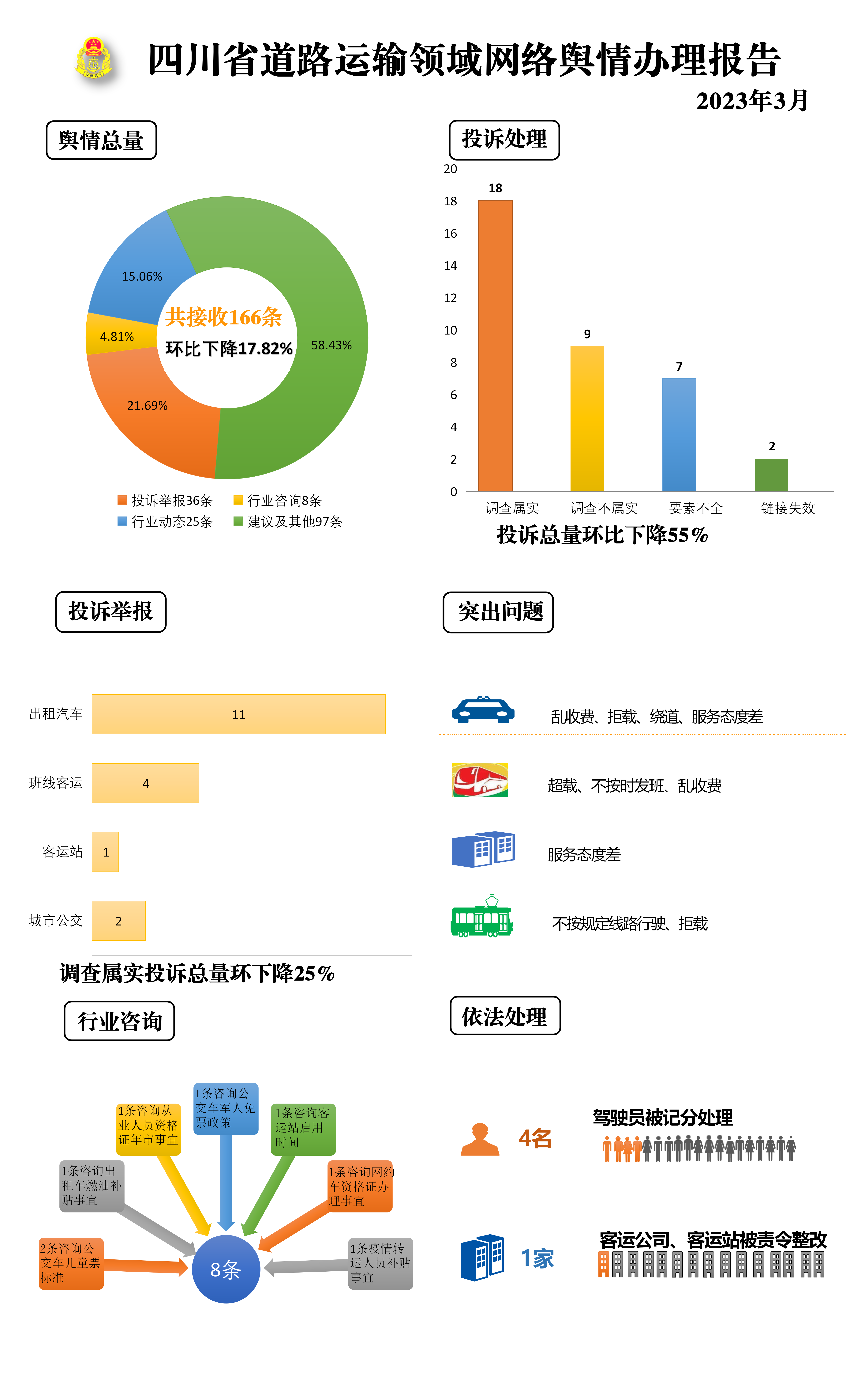 1.出租汽车11条。占投诉举报属实网络舆情总数的61.11%。主要投诉出租车乱收费、拒载、绕道、服务态度差(成都、巴中、广安、德阳、凉山、泸州、雅安)。