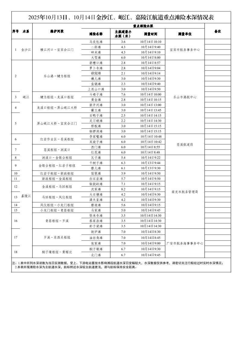 2025年10月13日、10月14日金沙江、岷江、嘉陵江航道重点滩险水深情况表