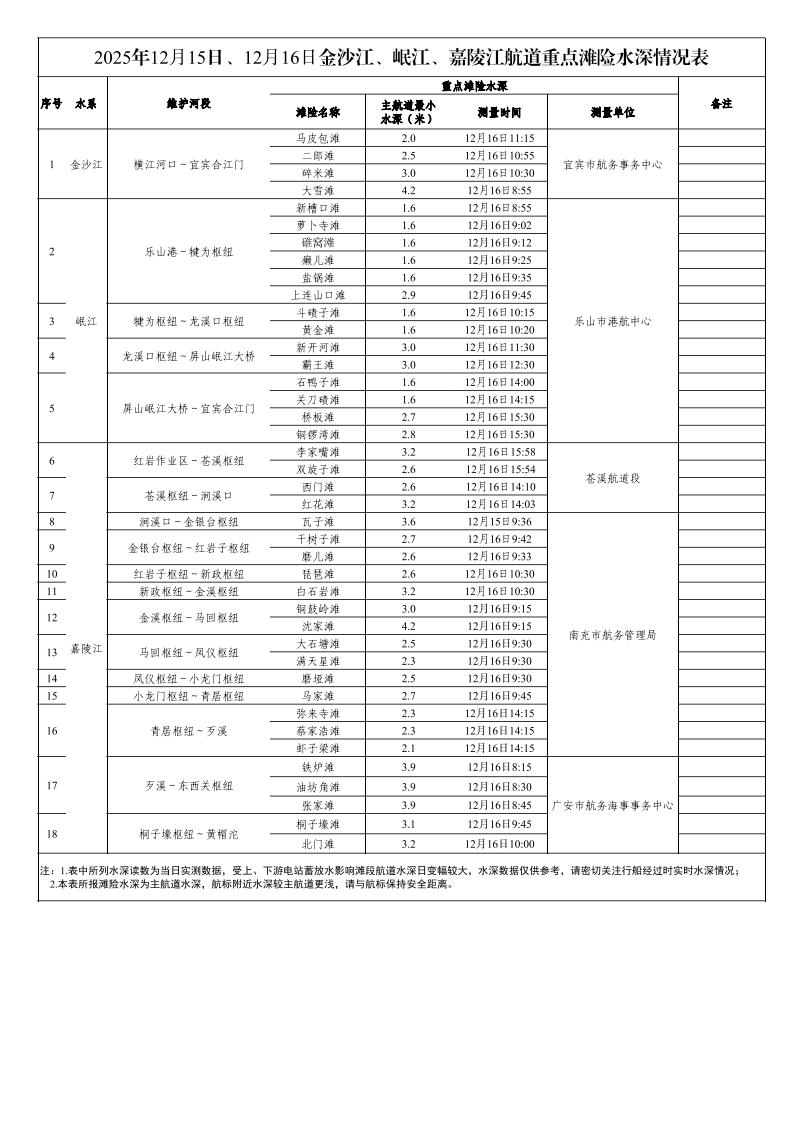 2025年12月15日、12月16日金沙江、岷江、嘉陵江航道重点滩险水深情况表